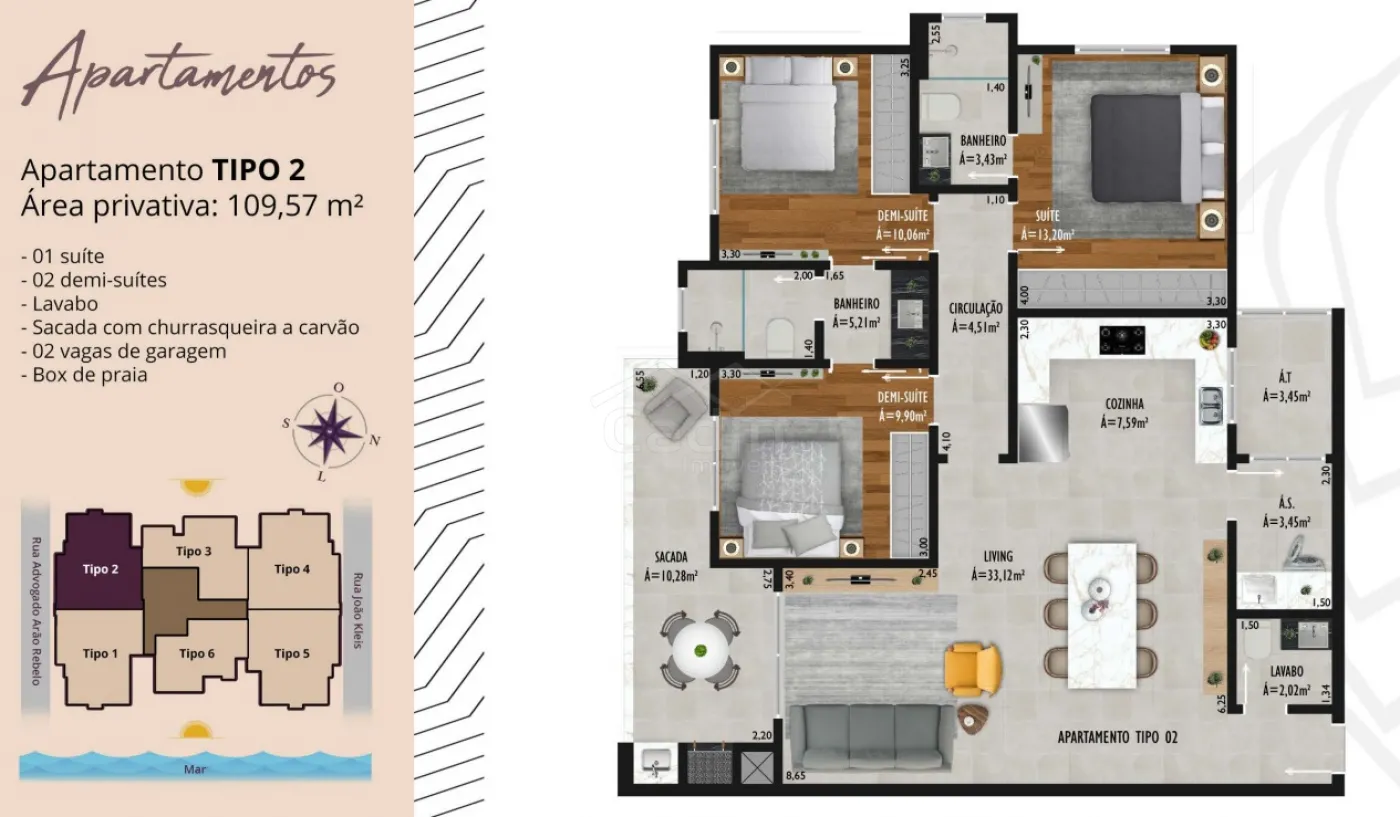 - 109,57 m² de área útil;