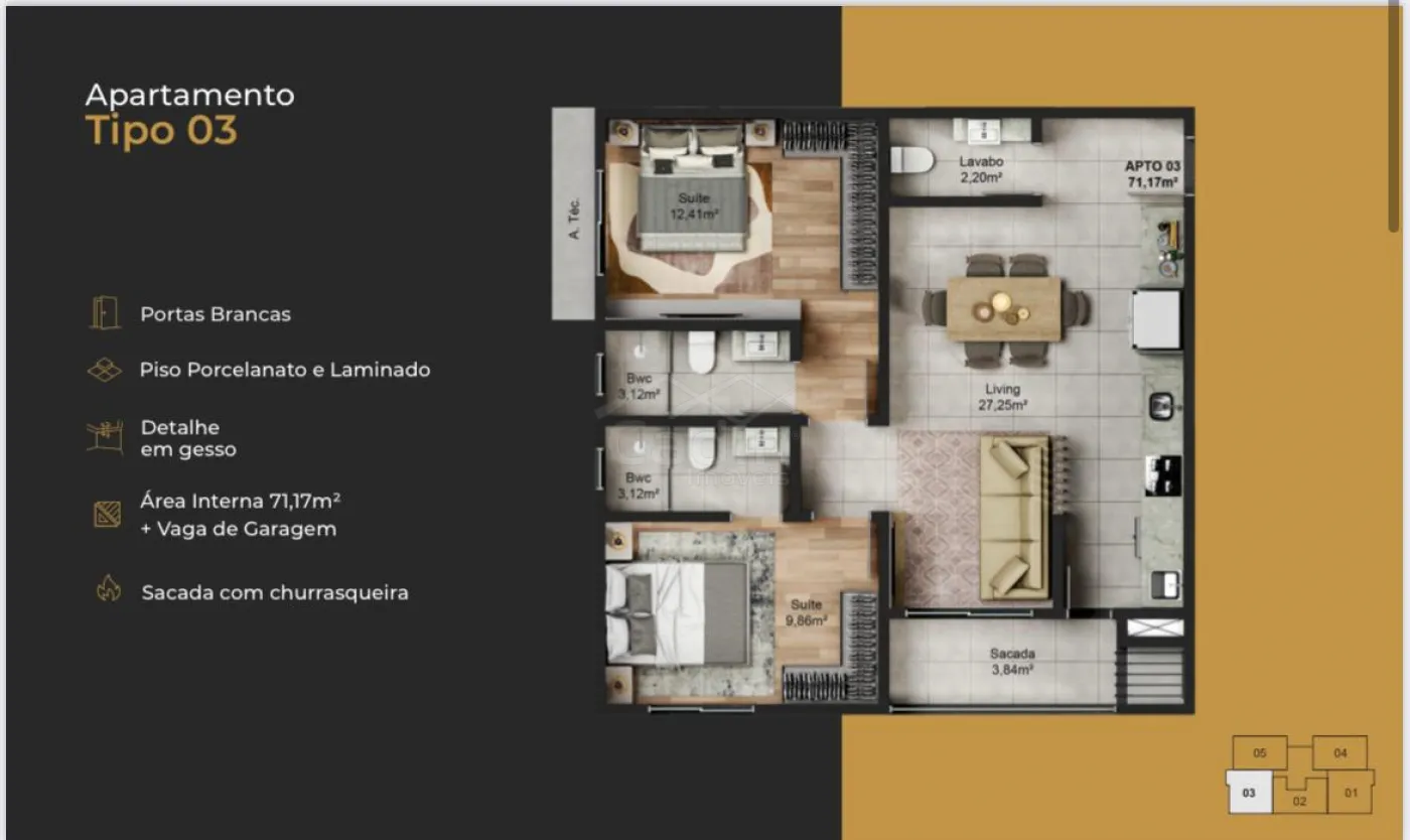 - 71,17m² de área privativa;