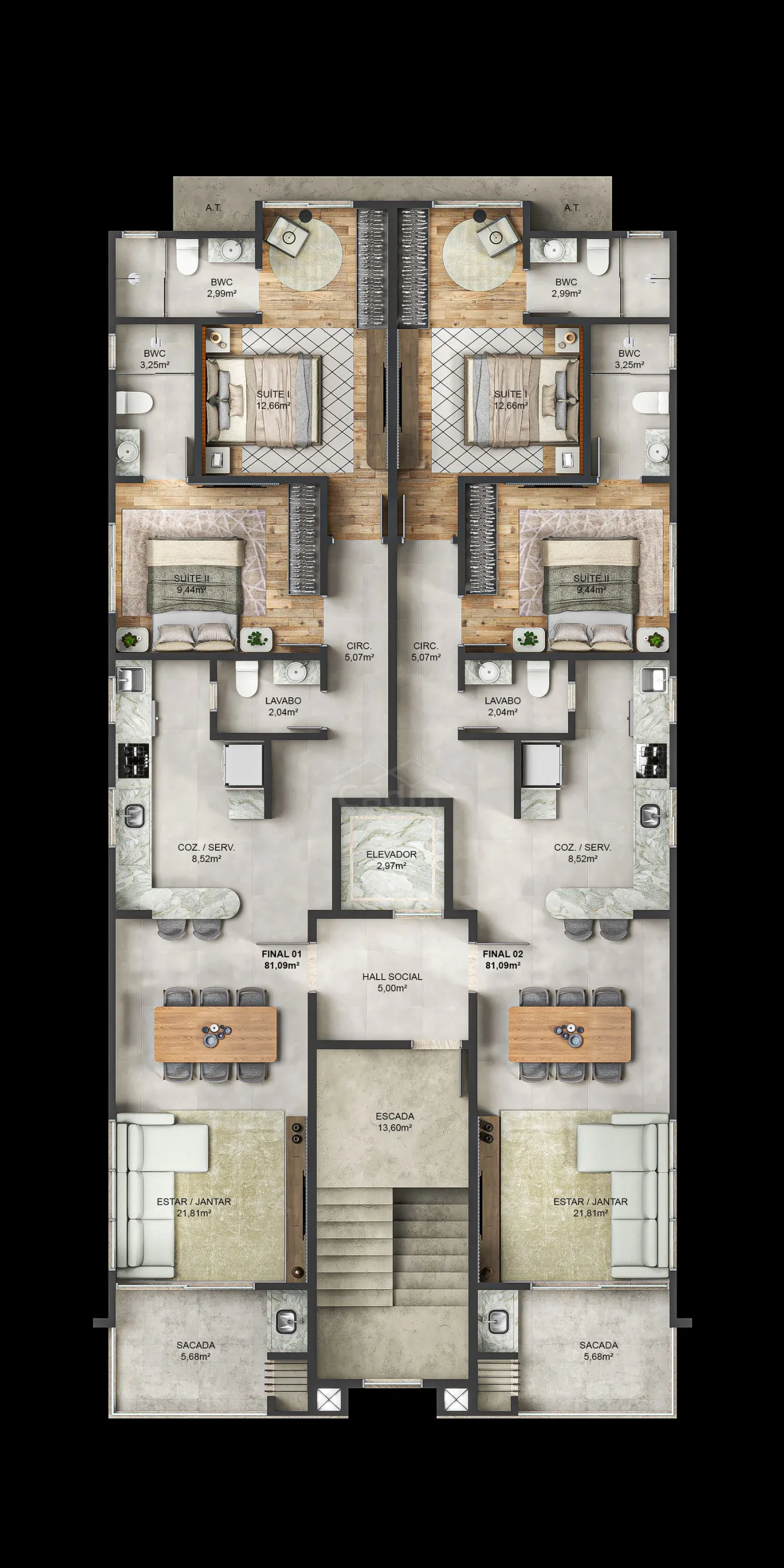 - 81,09m² de área privativa;