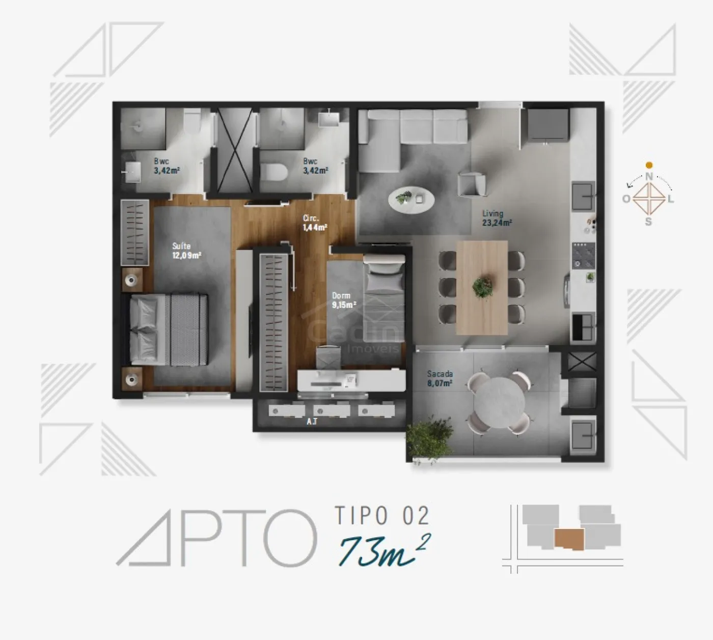 - 73,03m² de área privativa;